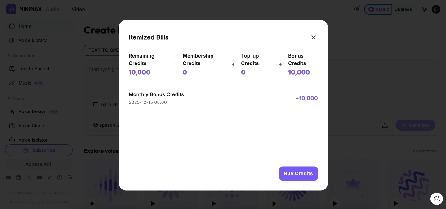 Think of these credits as your test drive for premium AI features. You get to explore voice cloning, generate music, and experiment with cutting-edge AI models without spending a dime upfront.